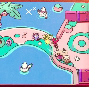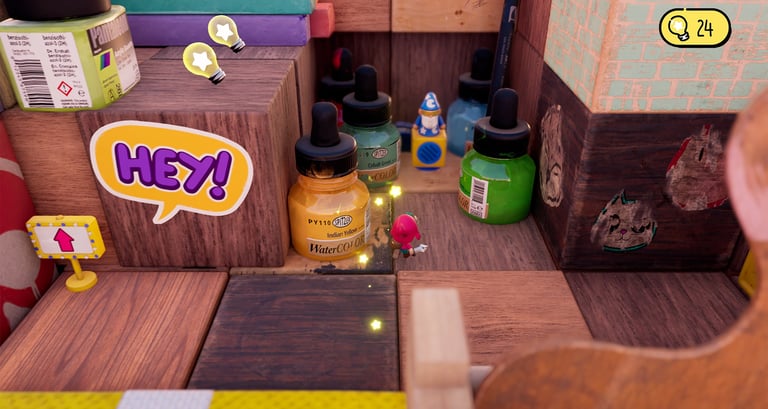A The Plucky Squire se lo puede encasillar dentro del género de acción/aventura, teniendo que sortear enemigos y puzzles. Siendo esto último lo que lo ha destacado. Ya que desde el primer momento en el que lo mostraron, se hizo hincapié en la habilidad de saltar desde el 2D de las páginas hacia el 3D de la “realidad” para resolver situaciones en ambas dimensiones. Teniendo que buscar algún ítem desde el exterior y llevarlos al interior del libro, o tener que pasar las hojas para resolver algunos de sus acertijos.